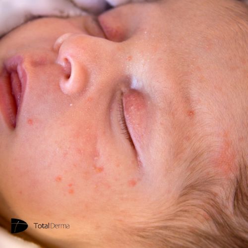 Οι βλάβες διακρίνονται σε φαγέσωρες ανοικτούς ( μαύρα στίγματα που αποτελούνται από σμήγμα, κερατίνη, τμήμα τριχών και υπολείμματα σμηγματογόνων αδένων) είτε κλειστούς (μικρά λευκά κεράτινα στίγματα), βλατίδες και φλύκταινες(κόκκινα σπυράκια που συνήθως συνοδεύονται με πύον) που εντοπίζονται στο μέτωπο και στα μάγουλα του νεογνού.